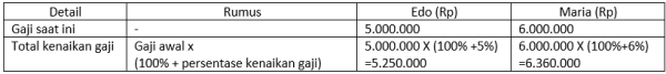 Perusahaan A ingin menaikkan gaji 2 karyawan : Edo 5% dan Maria 6%.