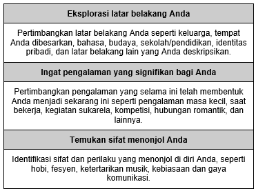 Setiap orang memiliki hal berharga yang bisa dibagikan. Yang perlu Anda lakukan adalah percaya pada diri Anda. Langkah pertama untuk melakukannya adalah ambil waktu sejenak dan refleksikan tentang semua hal yang membuat Anda menjadi diri Anda yang spesial.