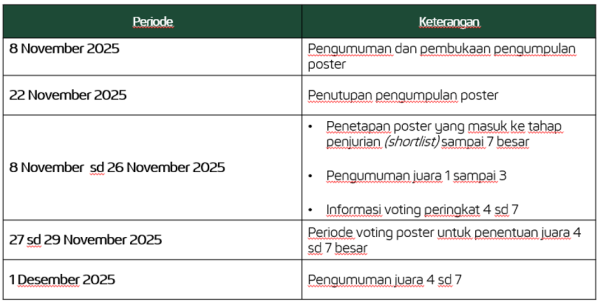 - Tim penyelenggara kompetisi melakukan penyaringan awal (shortlist) poster yang dikumpulkan oleh peserta menjadi maksimal 7 Poster yang akan masuk ke tahap penjurian
