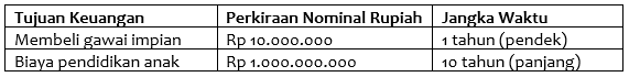 Setelah Anda menentukan tujuan keuangan, maka hal yang perlu dilakukan berikutnya adalah menentukan jangka waktu untuk mencapai tujuan keuangan dengan nominal yang telah Anda perkirakan. Hal ini pun akan mempengaruhi jenis investasi yang Akan Anda pilih. Jenis investasi berdasarkan jangka waktu, pada umumnya dibagi menjadi dua yaitu jangka pendek dan jangka panjang. Mungkin, Anda dapat membagi tujuan keuangan Anda menjadi dua. Misalnya: