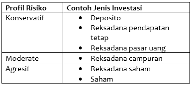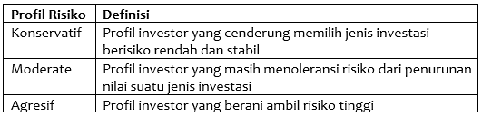 Lalu, bagaimana cara Anda menentukan profil risiko? Anda jangan khawatir, pada umumnya setiap perusahaan penyedia produk investasi akan memberikan suatu kuesioner untuk mengetahui profil risiko calon investornya. Anda hanya perlu isi kuesioner dengan jujur dan lengkap, lalu setelah itu Anda dapat mengetahui profil risiko Anda. Secara garis besar jenis profil risiko dibagi menjadi tiga, yaitu konservatif, moderat, dan agresif. Berikut perbedaan ketiganya yang dilansir dari situs Otoritas Jasa Keuangan (OJK):