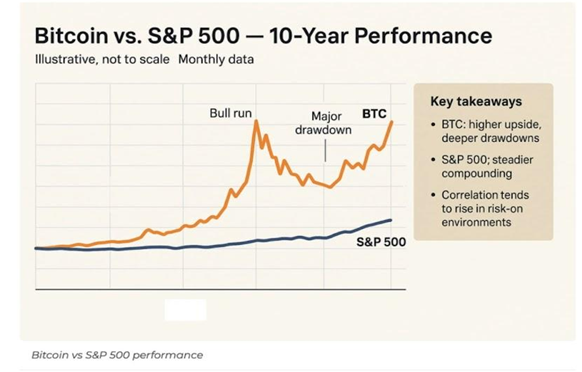 Berikut perbandingan imbal balik Bitcoin dengan S&P 500 dalam sepuluh tahun terakhir: