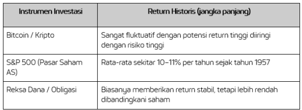 Karena kripto sangat fluktuatif, ia dapat memberikan hasil yang signifikan pada saat pasar bullish, namun juga dapat mengalami penurunan tajam saat pasar bearish. Di sisi lain, indeks saham seperti S&P 500 umumnya menawarkan pertumbuhan yang lebih konsisten dalam jangka panjang.