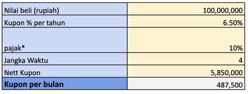 Pak Ari membeli obligasi jenis ST013-T4 yang akan jatuh tempo selama 4 tahun sebesar Rp 100.000.000. Kupon yang ditawarkan saat ini adalah 6.5% (floating floor). Maka berdasarkan perhitungan imbal hasil yang akan diterima Pak Ari setiap bulannya adalah Rp 487.500.