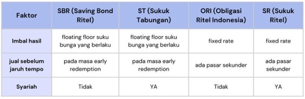 Di Indonesia, obligasi pemerintah dikenal dengan istilah Surat Berharga Negara (SBN), yang mencakup beberapa jenis seperti Obligasi Negara Ritel (ORI), Sukuk Ritel (SR), dan Savings Bond Ritel (SBR). Perbedaan dari setiap jenis obligasi negara bisa dilihat pada tabel di bawah ini: