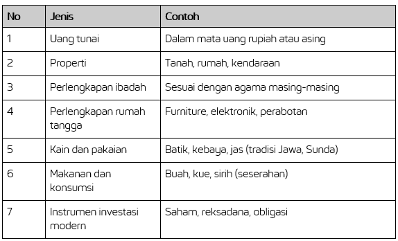 Umumnya mas kawin dan seserahan ini telah disepakati terlebih dahulu oleh kedua belah pihak, baik bentuknya dan nominalnya. Berdasarkan bentuknya, mas kawin dan seserahan dapat berupa: