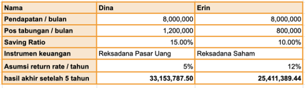 Walaupun Erin menyimpannya di instrumen investasi yang memiliki potensi tingkat imbal hasil yang lebih besar yaitu reksadana saham, tetapi hasil akhir di 5 (lima) tahun mendatang masih lebih rendah dibanding Dina yang menabung 15% dari penghasilannya walaupun hanya disimpan di instrumen keuangan yang imbal hasilnya lebih kecil (reksadana pasar uang). Asumsi ilustrasi di atas, imbal hasil reksadana pasar uang di sekitar 5% per tahun dan reksadana saham di 12% per tahun.