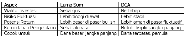 Strategi lump sum cocok diterapkan pada instrumen berisiko rendah hingga menengah seperti obligasi negara, reksa dana pasar uang, atau emas.