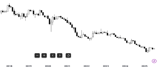 Ini adalah grafik pergerakan harga sebuah saham sejak tahun 2018 sampai 2025. Terlihat harga semakin menurun. Bila investor membeli di tahun 2018 dan masih menyimpannya sampai saat ini. Maka posisi investasinya sedang mengalami kerugian karena harga saat ini lebih rendah dari harga beli di tahun 2018.