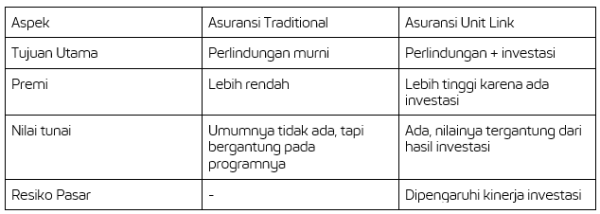 Asuransi dapat dibedakan jadi 2, yaitu traditional dan unit link. Asuransi traditional fokus berfungsi sebagai pelindung sedangkan asuransi unit link memiliki nilai tambahan dengan memasukkan unsur investasi selain perlindungan.