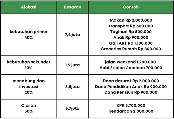 Dengan penghasilan gabungan suami dan istri Rp19.000.000 domisili Jabodetabek, maka goal based budgeting yang ditetapkan adalah sebagai berikut: