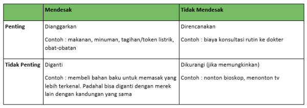 Dalam menentukan prioritas pengeluaran, pisahkan antara kebutuhan pokok, seperti pangan, pendidikan, dan kesehatan, dengan keinginan, seperti hiburan atau liburan. Dengan menentukan prioritas, Anda bisa memastikan pengeluaran dari yang paling penting dan harus terpenuhi terlebih dahulu sampai yang bisa ditunda pemenuhannya. Anda bisa menggunakan skala kuadran untuk membantu membedakan kebutuhan dan keinginan dengan contoh tabel berikut ini: