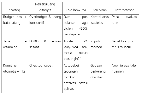 Intervensi praktis yang konsisten biasanya lebih efektif daripada “detoks belanja” yang ekstrem. Beberapa strategi yang bisa diterapkan: