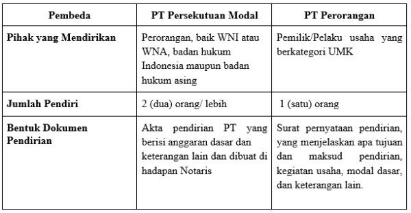 Terdapat beberapa perbedaan antara PT persekutuan modal dengan PT Perorangan, sebagaimana berikut: