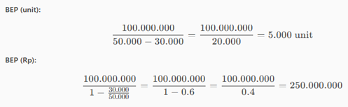 Jadi misalnya perusahan ABC memiliki biaya Tetap Rp100.000.000.  Harga jual per unit Rp 50.000, dan biaya variable per unit Rp30.000.