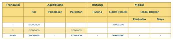 Tabel diatas menggambarkan perubahan ini, di mana saldo awal kas adalah Rp 10.000.000, kemudian berkurang menjadi Rp 7.000.000 setelah pembelian peralatan. Sementara itu, akun peralatan bertambah sebesar Rp 3.000.000.