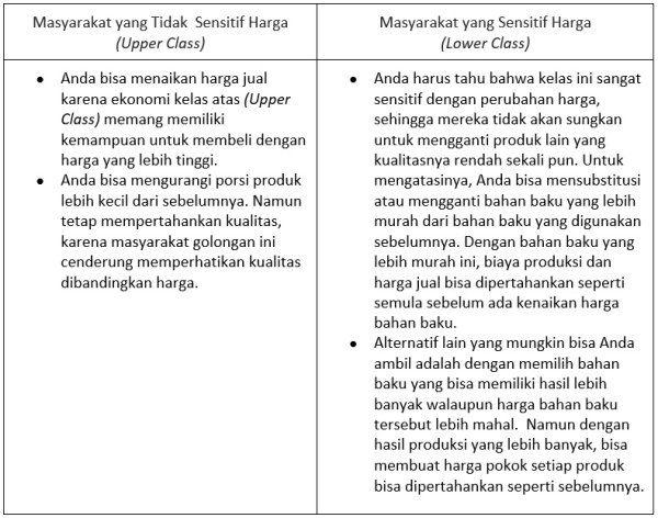 Ketika berhubungan dengan kenaikan harga bahan baku, Anda bisa menggolongkan konsumen Anda ke dalam Masyarakat yang Tidak Sensitif Harga (Upper Class) dan Masyarakat yang Sensitif Harga (Lower Class). Hal ini bertujuan untuk mempermudah Anda dalam memilih strategi apa yang cocok. Nah, berikut tabel penjelasannya: