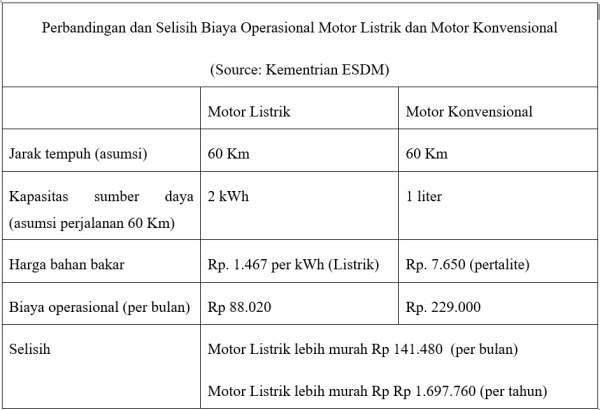Dari tabel di atas dapat diketahui bahwa penggunaan sepeda motor listrik disebut dapat menghemat sampai Rp 141 ribu menurut Kementerian ESDM. Hal tersebut didapatkan melihat tarif listrik PLN yang dibutuhkan sepeda motor listrik adalah Rp 1.467 per kWh. Maka untuk sepeda motor listrik berkapasitas baterai 2 kWh dengan jarak tempuh 60 Km membutuhkan biaya operasional sebesar Rp 88.020 dalam satu bulan. Sedangkan sepeda motor konvensional berdasarkan asumsi harga pertalite Rp 7.650 dan membutuhkan 1 liter untuk menempuh jarak 60 Km, maka membutuhkan biaya operasional sebesar 229.000 dalam satu bulan. Oleh karena itu dapat terlihat bahwa pengeluaran biaya operasional motor listrik Rp 141.480 lebih murah daripada pengeluaran biaya operasional motor konvensional.