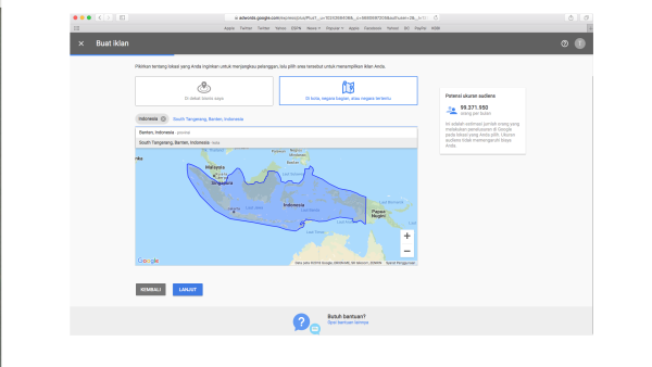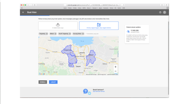 4. Pada laman ini, Anda akan diminta untuk menentukan cakupan pelanggan yang diinginkan. Tuliskan area spesifik, sesuai dengan jangkauan layanan yang dimiliki. Jika sudah, selesaikan dengan menekan tombol Berikutnya.