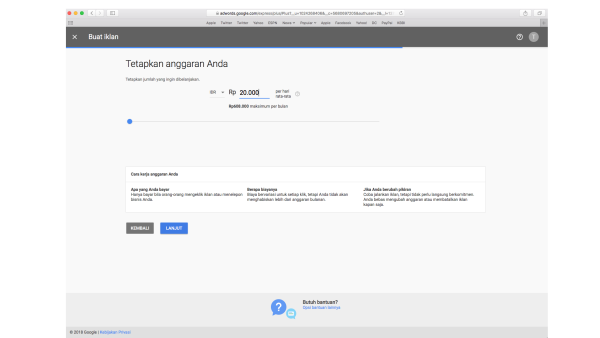 7. Di laman selanjutnya akan diminta menuliskan anggaran yang bersedia Anda keluarkan untuk beriklan. Harga yang dituliskan adalah besaran yang bersedia dibayarkan, setiap iklan mendapat klik dari pengunjung Google. Cobalah menuliskan harga terendah terlebih dahulu dan mengubahnya kemudian.