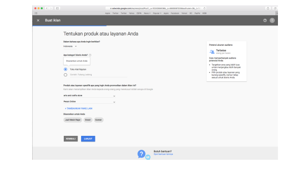 5. Selanjutnya, Anda akan diminta mengisi beberapa data seputar produk dan layanan bisnis. Masukkan penggunaan bahasa yang diinginkan, tentukan kategori bisnis, dan buat beberapa kata kunci yang ingin dipromosikan agar saat orang melakukan pencarian di Google Search, iklan dapat ditampilkan. Pada laman ini, Anda dapat melihat boks di sebelah kanan yang menampilkan potensi audience yang bisa didapatkan dalam satu bulan.