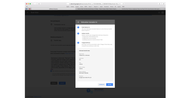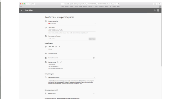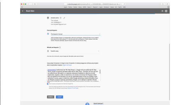9. Konfirmasikan pembayaran, alamat penagihan dan jenis pembayaran yang ingin dilakukan. Pembayaran dapat dilakukan secara otomatis pemotongan atau manual dengan mengisi sejumlah saldo tertentu yang akan dipotong setiap kali muncul tagihan. Cara pembayaran juga dapat dilakukan dengan kartu kredit ataupun dapat menggunakan transfer ke rekening milik Google.com. Jika sudah mengisikan pilihan pembayaran, klik Lanjut.