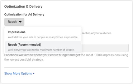 Anda dapat memilih objective ini jika tujuan Anda adalah untuk mendapatkan sebanyak mungkin audiens yang melihat iklan Anda tanpa mengharapkan mereka akan melakukan aksi lanjutan setelahnya. Facebook akan menunjukkan iklan Anda kepada sebanyak-banyaknya orang yang menjadi target audiens Anda dengan budget yang sudah ditentukan.