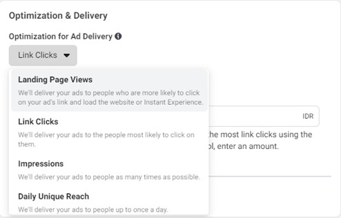 Di level ad set, Anda dapat memilih untuk mengoptimasi conversion event yang paling relevan berdasarkan tujuan Anda dan Facebook akan menunjukkan iklan Anda ke target audiens yang kemungkinan besar akan mengambil aksi terhadap iklan tersebut.