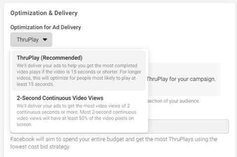 Facebook akan memprioritaskan untuk menunjukkan iklan video Anda ke target audiens yang kemungkinan besar akan menonton video tersebut. Ketika menciptakan campaign video views, Anda dapat memilih untuk menunjukkan iklan Anda ke audiens yang kemungkinan besar akan menonton iklan Anda setidaknya selama 2 hingga 15 detik.