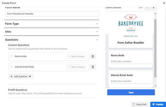 Objective lead generation memungkinkan Anda untuk menambahkan form kontak ke Facebook Ads. Anda dapat mengkostumisasi form tersebut untuk menanyakan pertanyaan yang lebih mendalam jika Anda butuh informasi lebih dari prospek.