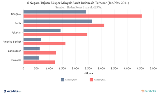 Indonesia saat ini menguasai kurang lebih 55% pangsa pasar ekspor sawit global. Pada periode Januari-November 2021, Indonesia berhasil mengekspor minyak sawit (Crude Palm Oil/CPO) mencapai US$26,03 miliar. Nilai tersebut tumbuh Meningkat 61,72% dari tahun sebelumnya pada periode yang sama yang hanya sebesar US$16,1 miliar.