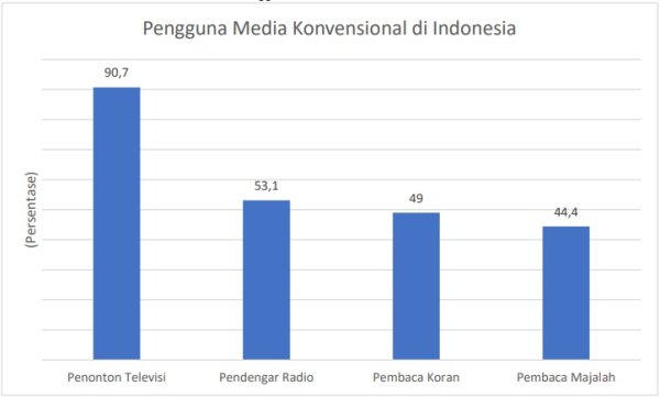 Berdasarkan data tersebut, dapat terlihat bahwa masyarakat Indonesia lebih banyak menggunakan televisi sebagai media konvesional dibandingkan dengan media lainnya. Tercatat bahwa pengguna televisi di Indonesia telah mencapai sebesar 90,7%. Sedangkan pengguna media lainnya seperti pendengar radio hanya berkontribusi sebesar 53,1%, pembaca koran 49% dan pembaca majalah 44,4%.