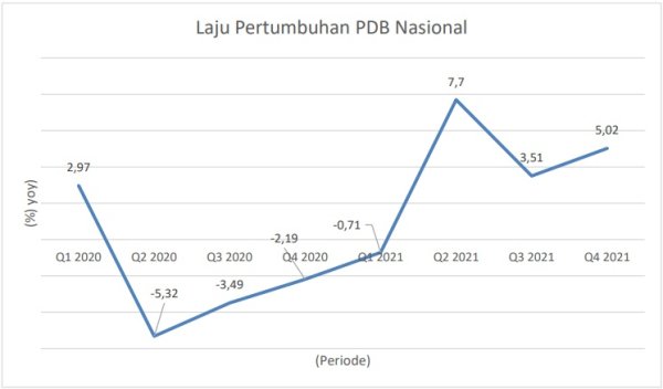 Berdasarkan data tersebut, dapat terlihat bahwa perekonomian Indonesia pada Q3 2021 tetap tumbuh positif meskipun melambat dibandingkan dengan capaian Q2 2021, sejalan dengan merebaknya varian delta Covid-19. Ekonomi Indonesia pada Q4 2021 tumbuh sebesar 3,51% (yoy), hingga Q4 2020 sebesar -2,07%. Perkembangan tersebut terutama ditopang oleh kinerja ekspor sejalan dengan tetap kuatnya permintaan mitra dagang utama.