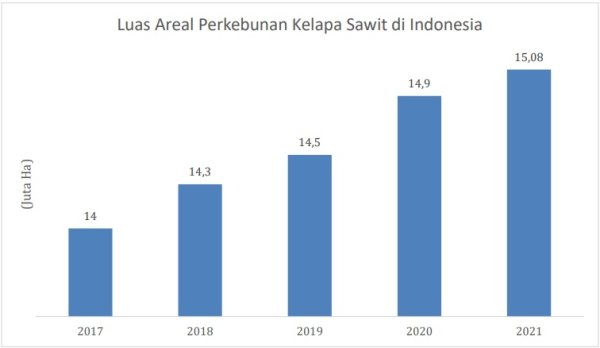 Kementerian Pertanian (Kementan) mencatat, luas perkebunan minyak kelapa sawit mencapai 15,08 juta hektare (ha) pada 2021. Luas perkebunan tersebut naik 1,5% dibanding tahun sebelumnya yang seluas 1,48 juta. Terlebih, luas perkebunan meningkat sejak tahun 2017. Hal ini dipengaruhi oleh harga CPO dunia yang cukup baik dan stabil, sebagai minyak biofuel pengganti minyak fosil dan diawali dengan pengembangan perkebunan kelapa sawit melalui proyek pemerintah.