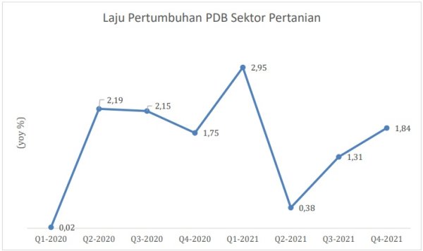 Berdasarkan data tersebut, pertumbuhan PDB sektor pertanian mengalami penurunan pada Q2 2020 hingga Q4 2020, yang disebabkan oleh penurunan jumlah produksi yang terkendala oleh adanya keterbatasan dalam rantai pasokan pangan. Akan tetapi, selalu tumbuh positif pada masa pandemi Covid-19. Oleh karena itu, Menteri Koordinator Bidang Perekonomian Airlangga Hartarto mengapresiasi kinerja sektor pertanian selama masa pandemi. Ketika sektor lain terdampak, pertanian justru mengalami pertumbuhan positif. Terlebih, PDB Indonesia diproyeksikan meningkat 5,2% pada 2022.
