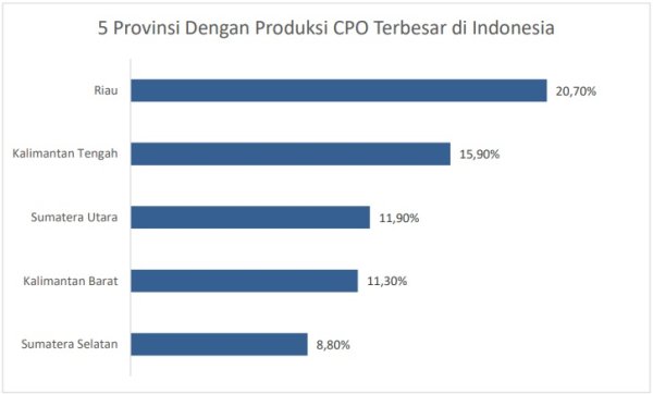 Riau dan Sumut tetap menjadi produsen CPO terbesar Produksi minyak sawit Indonesia terutama berasal dari 5 provinsi yang memberikan kontribusi sebesar 68,7% dari total produksi minyak sawit Indonesia pada 2021. Provinsi Riau dan merupakan provinsi dengan kontribusi produksi terbesar, dan diikuti 4 provinsi lainnya. Berikut merupakan datanya: