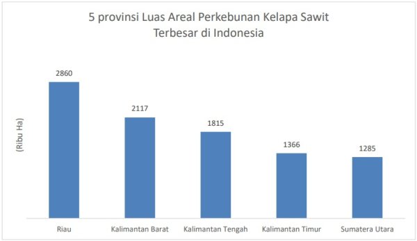Dari data Badan Pusat Statistika (BPS) mencatat bahwa terdapat 5 provinsi dengan luas areal perkebunan kelapa sawit terbesar di Indonesia. Tercatat bahwa provinsi Riau menduduki peringkat pertama. Berikut merupakan datanya: