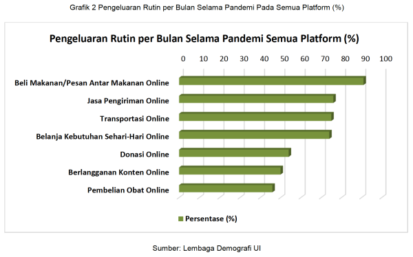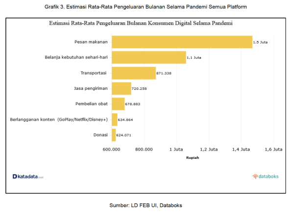 Riset Lembaga Demografi Fakultas Ekonomi dan Bisnis Universitas Indonesia (LD FEB UI) mencatat estimasi rata-rata pengeluaran bulanan konsumen selama pandemi corona melalui platform digital untuk memesan makanan secara online mencapai Rp 1,4 juta per bulan.