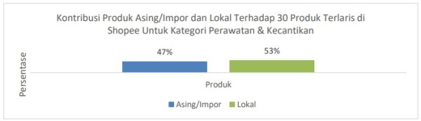 Grafik di atas mengilustrasikan persentase produk asing/impor yang terdaftar dalam top 30 produk Shopee paling laris untuk kategori Perawatan & Kecantikan. Berdasarkan data yang diperoleh dari Shopee, tercatat bahwa setidaknya terdapat 14 atau 47% produk asing/impor yang memberikan kontribusi terhadap top 30 produk terlaris di Shopee untuk kategori Perawatan & Kecantikan.