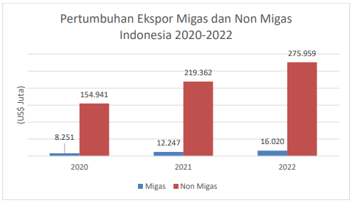 Selain itu, nilai ekspor non migas turut menyumbang dalam neraca perdagangan di Indonesia pada 2022, yang dimana tercatat sebesar US$ 275.959,4 juta dibandingkan ekspor migas yaitu sebesar US$ 16.019,7 juta. Berikut merupakan datanya: