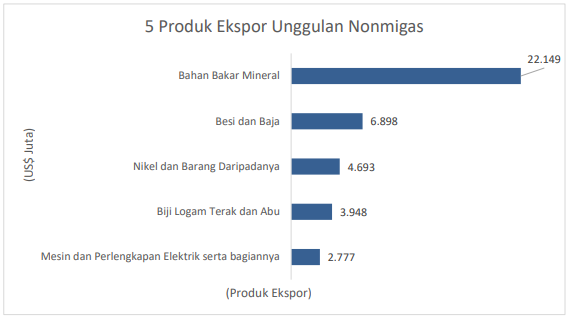 Total nilai ekspor non migas pada periode 2022 terhadap negara tujuan Tiongkok tetap merupakan negara tujuan ekspor yang memiliki peranan terbesar dengan nilai ekspor sebesar US$12.457,8 juta, diikuti India dengan nilai sebesar US$10.168 juta, dan Jepang sebesar US$6.300,2 juta. Komoditas utama yang diekspor ke Tiongkok pada periode tersebut adalah besi/baja, batubara, dan lignit. Sementara itu ekspor ke kawasan ASEAN dan Uni Eropa pada periode tersebut kontribusinya masing-masing 19,67% dan 8,07%.