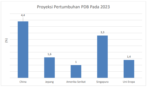 World Economic Outlook (WEO) dari IMF per Oktober 2022 melaporkan bahwa pertumbuhan ekonomi beberapa negara, termasuk mitra dagang Indonesia diprediksi mengalami penurunan produk domestic bruto (PDB) pada tahun 2023. Berikut merupakan datanya: