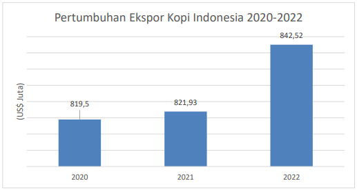 Produk kopi merupakan komoditas ekspor terbesar kedua di dunia. Di Indonesia terdapat beragam jenis asal kopi dari berbagai daerah di Sumatera, Jawa, Bali, Flores, sampai Papua. Sudah terbukti masing-masing jenis kopi tersebut memiliki cita rasa yang khas dan unik. Paling terkenal di antara kopi-kopi spesial ini adalah kopi luwak, kopi Toraja, kopi Aceh dan kopi Mandailing. Arabika dan Robusta adalah dua jenis kopi yang paling diminati di pasar global. Maka dari itu, nilai ekspor kopi Indonesia sepanjang 2022 tercatat mencapai US$ 842,52 juta yang dimana meningkat selama 3 tahun terakhir ini. Berikut merupakan datanya: