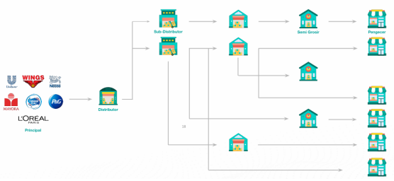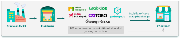 B2B FMCG tradisional memiliki cara distribusi yang berbeda dengan B2B FMCG Marketplace. Dealstreetasia melaporkan rantai pasokan dari B2B FMCG tradisional, berikut rantai pasokannya: